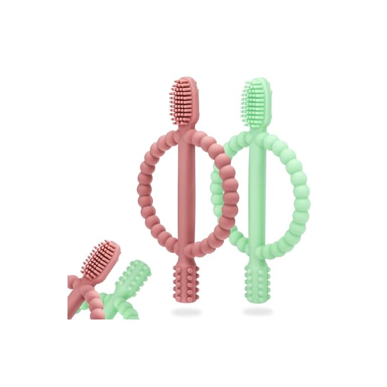 Baby Teething Toys with Easy-Hold Handle, Silicone Infant Toothbrush, Textured On Both Sides Helps Massage, Soothe Sore Gums, Teething Toys for Babies 0-6 Months, 6-12 Months Bright Green & Caramel