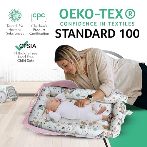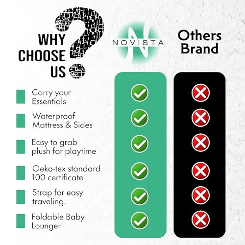 ULTIMATE COMFORT AND PROTECTION – our Novista portable baby lounger, designed for newborns and infants, is Oeko-Tex Standard 100 certified offering unparalleled comfort and safety. With a waterproof layer beneath the surface, it effectively protects the lounger from spills and accidents, ensuring the cotton filling remains intact and durable for longer use