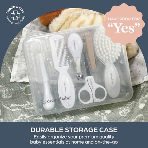 Dreambaby Essential Grooming Kit is packed with the necessary items to help keep your baby well groomed and healthy. Packed in a convenient storage case, it is easy to keep organized and great for travel. It includes a hair brush, comb, toothbrush, nail clippers, scissors, emery boards, and a storage case.
