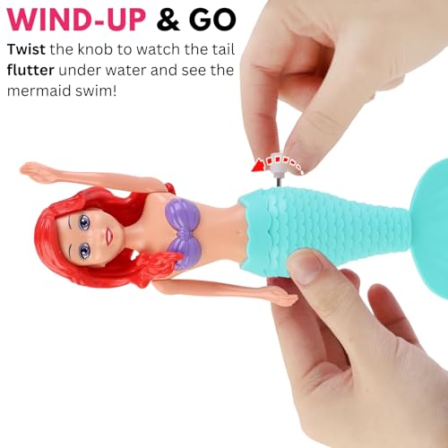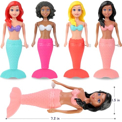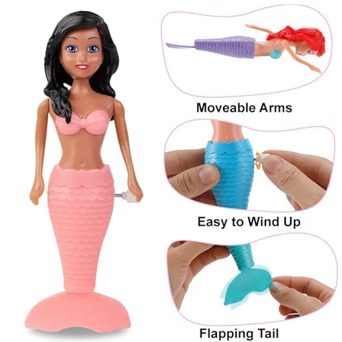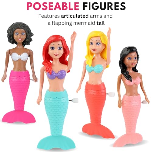 Wind up & go: Splash and swim with a pack of mermaids; set of 4 wind-up mermaid toys provides hours of fun for kids and adults; turn the knob to watch the tail flap underwater and see the mermaid swim; no batteries required