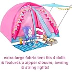 The extra-large fabric tent fits 4 dolls and features an awning and super-cool string lights.