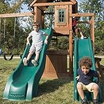 Create an instant play land with the knightsbridge deluxe Wood complete play set by Swing-N-Slide. This backyard swing set features two swing seats with coated chain and a wind rider glider, each Designed to support up to 115 pounds. Designed to compliment any yard, this kit features a durable wooden roof with decorative sunburst gable and two windows. Includes the cool wave slide and the Alpine wave slide, each backed by a Lifetime warranty against cracks and breaks. Two play deck heights include a climbing rock wall, ladder, picnic table and much more. All pre-cut, pre-stained lumber, hardware, and instructions are included.