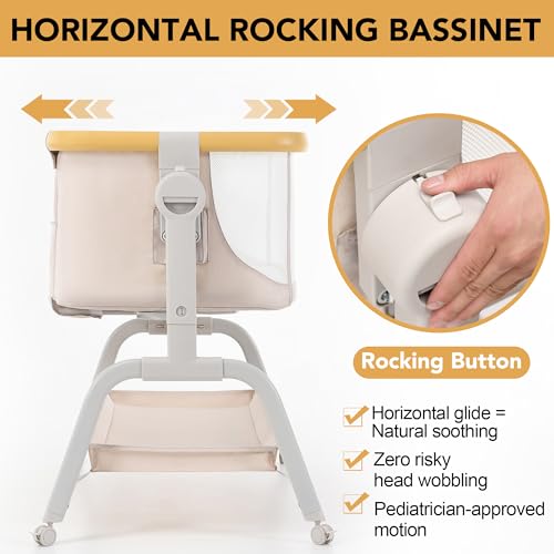 【Gentle Horizontal Rocking & Quiet Wheels】Push the bassinet horizontally (not arc-shaped) to soothe your baby safely. 4 rubber wheels (each with individual locks) protect floors and roll quietly. Tip: Unlock all wheels when moving, lock when stationary.
