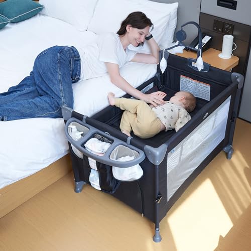 5 in 1 Baby Bedside Sleeper,Baby Pack and Play with Bassinet & Mattress,Portable Bedside Crib with Storage, Playard with Bassinet from Newborn to Toddlers(Dark Grey) (Light Gray)