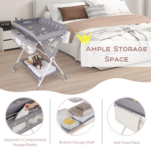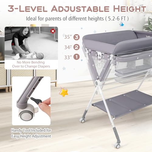 BABY JOY Portable Baby Changing Table, Foldable Diaper Changing Station with Wheels, Adjustable Height, Large Storage Rack, Trash Can, Mobile Nursery Organizer for Newborn Infant (Gray)