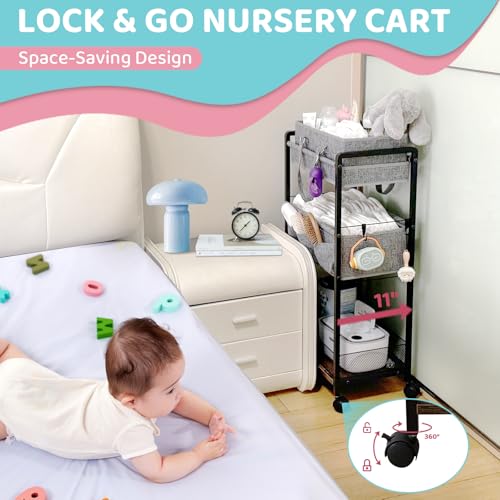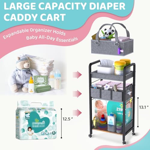 2IN1 Baby Diaper Caddy Organizer-3 Tier Rolling Storage Cart with Dividers – Bedside Diaper Caddy Cart for Baby Nursery Newborn Essentials-Mobile Utility Carts with Wheels for Changing Table