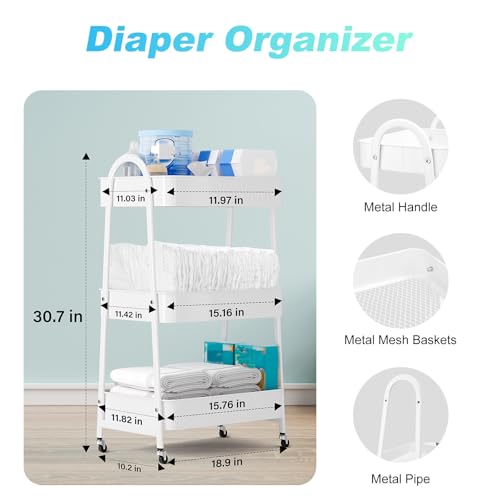 Baby Diaper Caddy Organizer, Metal Utility Diaper Cart, Multifunction Essential Newborn Baby Registry Items, Movable Changing Station/Easy Assembly, White