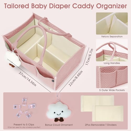 Skycase Diaper Caddy Basket: Our material is soft and also won’t collapse(when you haven’t packed any items yet). This versatile diaper organizer has 5 external pockets, including 2 pieces removable organizing dividers, and comes with an charming furry cloud and 5 pieces clips, adding a touch of pleasure