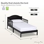 Let your little one transition from a crib to a toddler bed with ease thanks to the Dream On Me Sydney Toddler Bed! The bed sits low to the floor making getting in and out easy. It comes with two side safety rails and the center legs provide reinforced stability. The Sydney sports a chic and modern silhouette – the bell-shaped full panel headboard design will blend nicely into any kid’s room, making it a beautifully crafted piece of furniture. It is available in elegant, non-toxic finishes – perfect to go with whatever decor theme your toddler wants! Safety is always our top priority. The toddler bed is JPMA certified and designed to meet/exceed all applicable ASTM and CPSC standards. It is free of phthalates, latex, lead and BPA and is ergonomic, stable and sturdy. Sturdy wooden slats provide mattress support. The dimensions are 53L x 29W x 28H inches and it weighs 19 lbs. Maximum weight limit is 50 lbs. Choose any Dream On Me non-toxic, Greenguard certified standard crib mattress for a perfect fit.