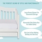 This handsomely designed, durable, solid wood toddler bed, looks like a day bed but is low to the floor for your toddlers convenience plus has the security of a safety rail to prevent accidental falls while sleeping. It features a roomy storage drawer underneath the bed, wooden mattress support so there is no need for a box spring and an appealing non toxic finish. This attractive day bed accommodates a Dream On Me crib mattress, sold separately. Recommended for children 18 months to 5 years old up to 50 pounds. All tools needed for easy assembly are included.