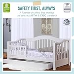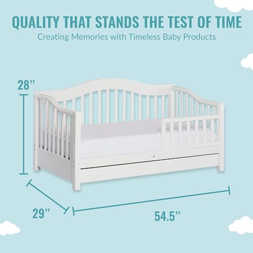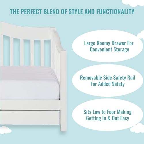 The Dream On Me Toddler Day Bed is the ideal transition bed for when your child is too big for a crib but too small for a full-size bed. It features a convenient low-to-floor design, making it easy for your child to get in and out of bed. A removable side safety guard rail prevents any accidental falls for the restless sleeper!The Day Bed’s design is stylish and functional. A mix of curved and straight lines makes it perfect to blend in with a variety of room decors. Let your child pick from five stylish non-toxic finishes!Keep bed linen and your child’s essentials handy in the roomy storage drawer below the bed. Two compartments allow you to keep everything neatly organized! The Toddler Day Bed comes with a wooden mattress support so there is no need for a box spring. Choose any Dream On Me non-toxic, Greenguard certified standard crib mattress for a perfect fit. The Toddler Day Bed is JPMA certified and meets/exceeds all applicable ASTM and CPSC standards. All tools needed for assembly are included. Recommended for children 18 months to 5 years old or up to 50 lbs. Product specs are: 54.5Lx29Wx28.