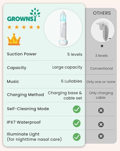 GROWNSY Nasal Aspirator for Baby, Upgraded 5 Suction Levels Baby Nose Sucker, IPX7 Waterproof Electric Nose Suction for Baby, Booger Sucker for Toddlers with Automatic Cleaning &Music &Light Functions