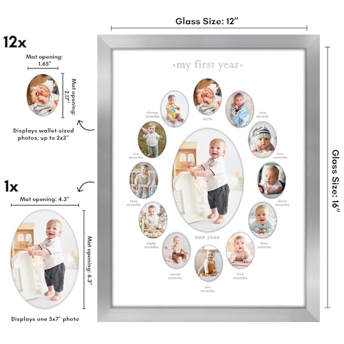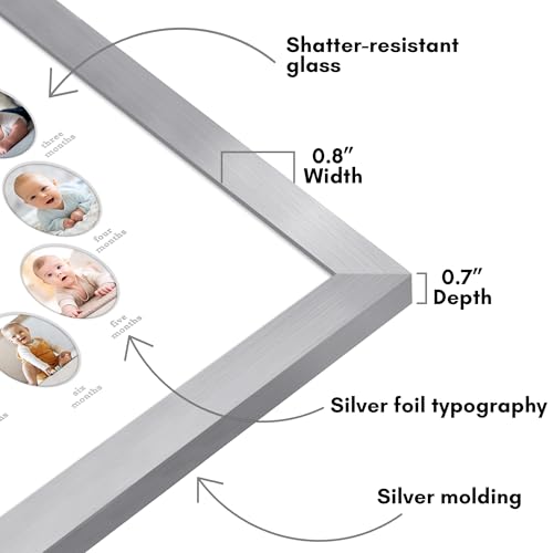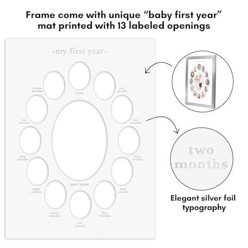 Turn your baby’s first year into a timeless memory with the Americanflat 12×16 first year photo frame in a elegant silver finish – because those first twelve months fly by, and you’ll want every moment beautifully preserved. Crafted from durable engineered wood (MDF), this photo collage frame is designed to showcase your baby’s milestones withe love and style. Featuring 13 openings on a white mat, these silver picture frames hold twelve 2×3 photos (one for each month) and one larger 5×7 picture for that extra special moment (the actual mat areas are 4×6 inches and 1.5×2 inches), making it easy to organize your memories month by month. Hanging this frame? A total breeze! Equipped with built-in hanging hardware, it’s easy to mount on your wall, whether in the nursery, living room, or office. Our my first year photo frame isn’t just about displaying memories, it’s about protecting them too. With shatter-resistant glass, it offers clarity while keeping your precious photos safe from dust and damage. The sturdy backboard and easy-to-use turn points make inserting or updating photos simple. Why go for anything less when your baby’s first year deserves a frame this special? Order your picture frame today and join thousands of satisfied customers who’ve transformed their spaces with Americanflat.