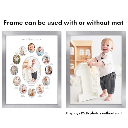 Americanflat 12×16 First Year Photo Frame with Shatter-Resistant Glass – Fits Twelve 2×3 Photos and One 5×7 Picture – Collage Frame for Nursery Decor, Newborn Mom Gift or Baby Shower- Silver