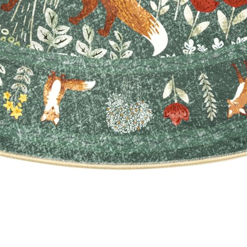Cute Woodland Forest Kids Rug Boho Floral Round Nursery Rug, Green Aesthetic Bedroom Rug Abstract Tropical 5ft Circle Carpet Washable, Botanical Animals Area Rug for Living Room Entryway Kitchen